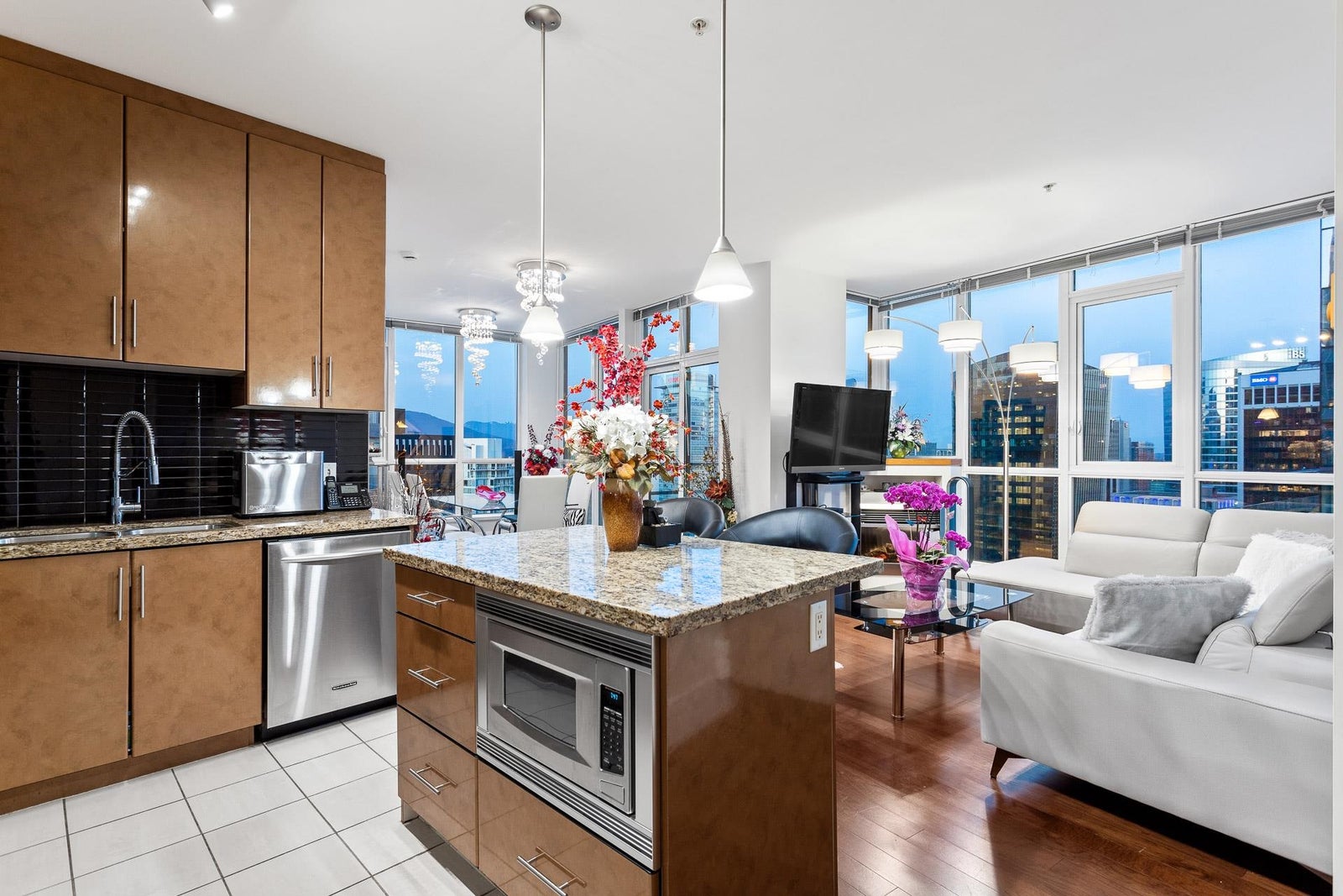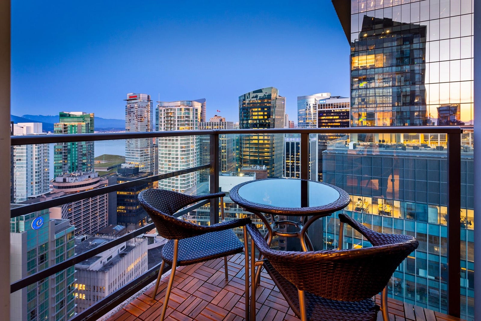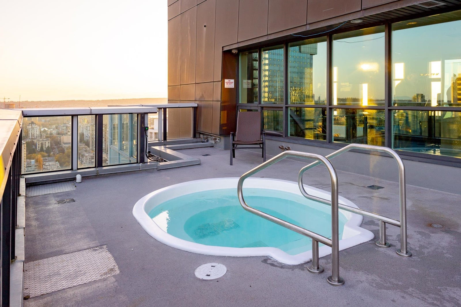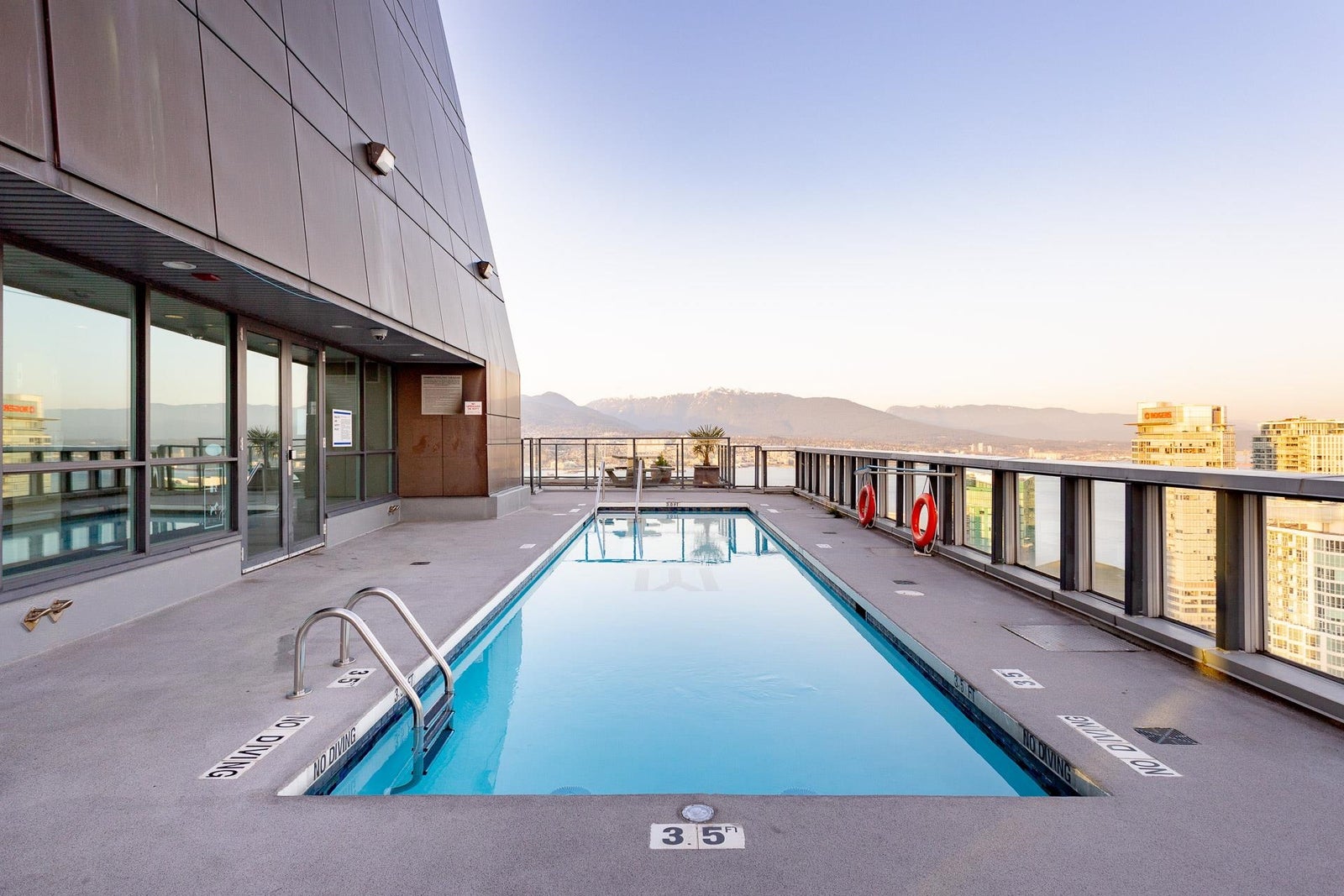 Amazing Coal Harbour living in the highly sought after building “The Melville”. This executive super well maintained 2 Bed/2 Bath upper floor corner unit offers over-height ceilings w/modern city & ocean views from the floor to ceilings windows & covered balcony. Large gourmet kitchen with tons of cabinets, stainless steel KitchenAid appliances with gas range & island with breakfast bar seating. Enjoy the convenience of an in-suite storage room & an additional underground storage. One of only a few residential towers in Vancouver with rooftop amenities, you will experience panoramic views from English Bay to Burrard Inlet, complete w/ fitness centre, sauna, outdoor swimming pool, jacuzzi, perfect for viewing the fireworks, sunsets, or observing all the activity & beauty of the city.