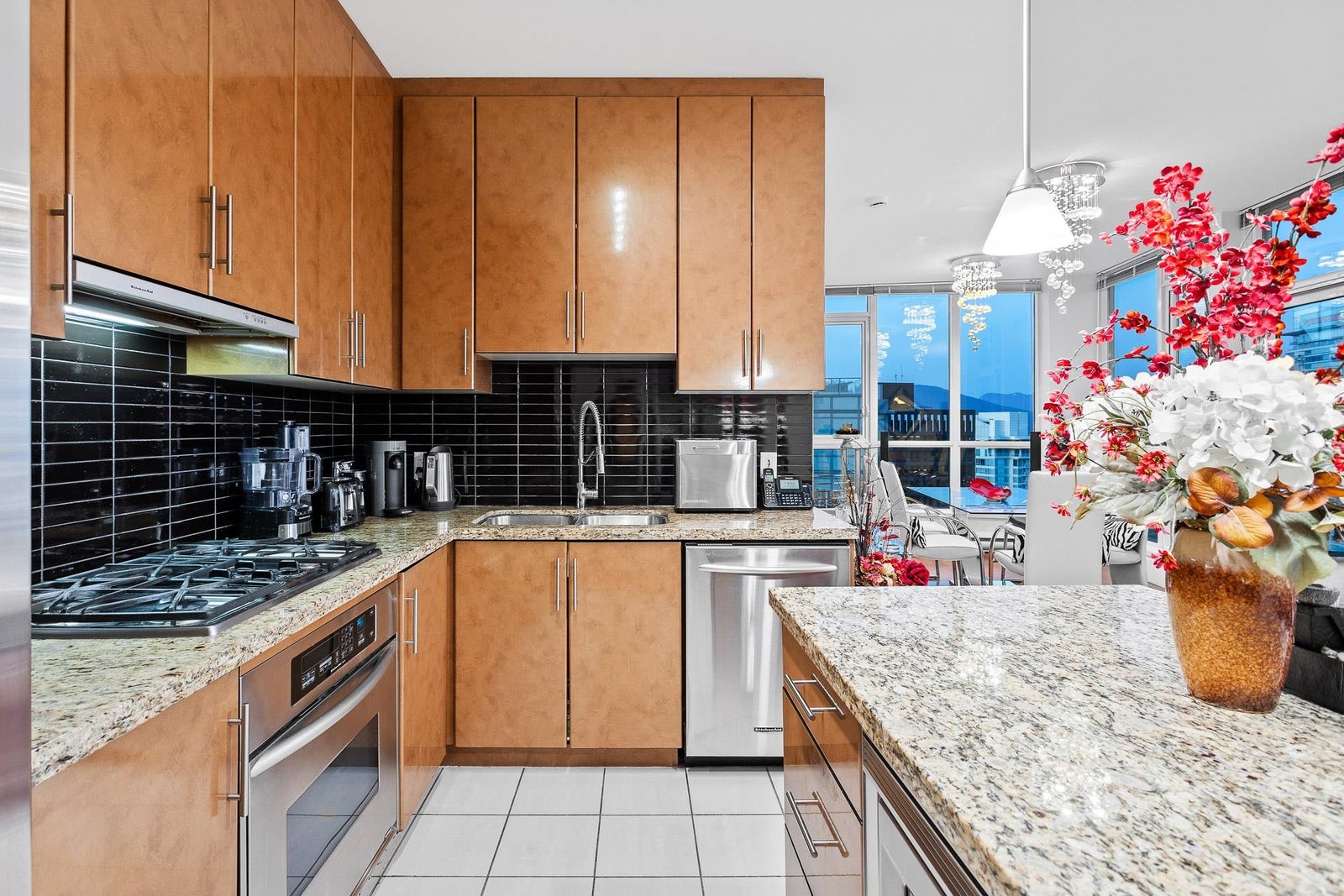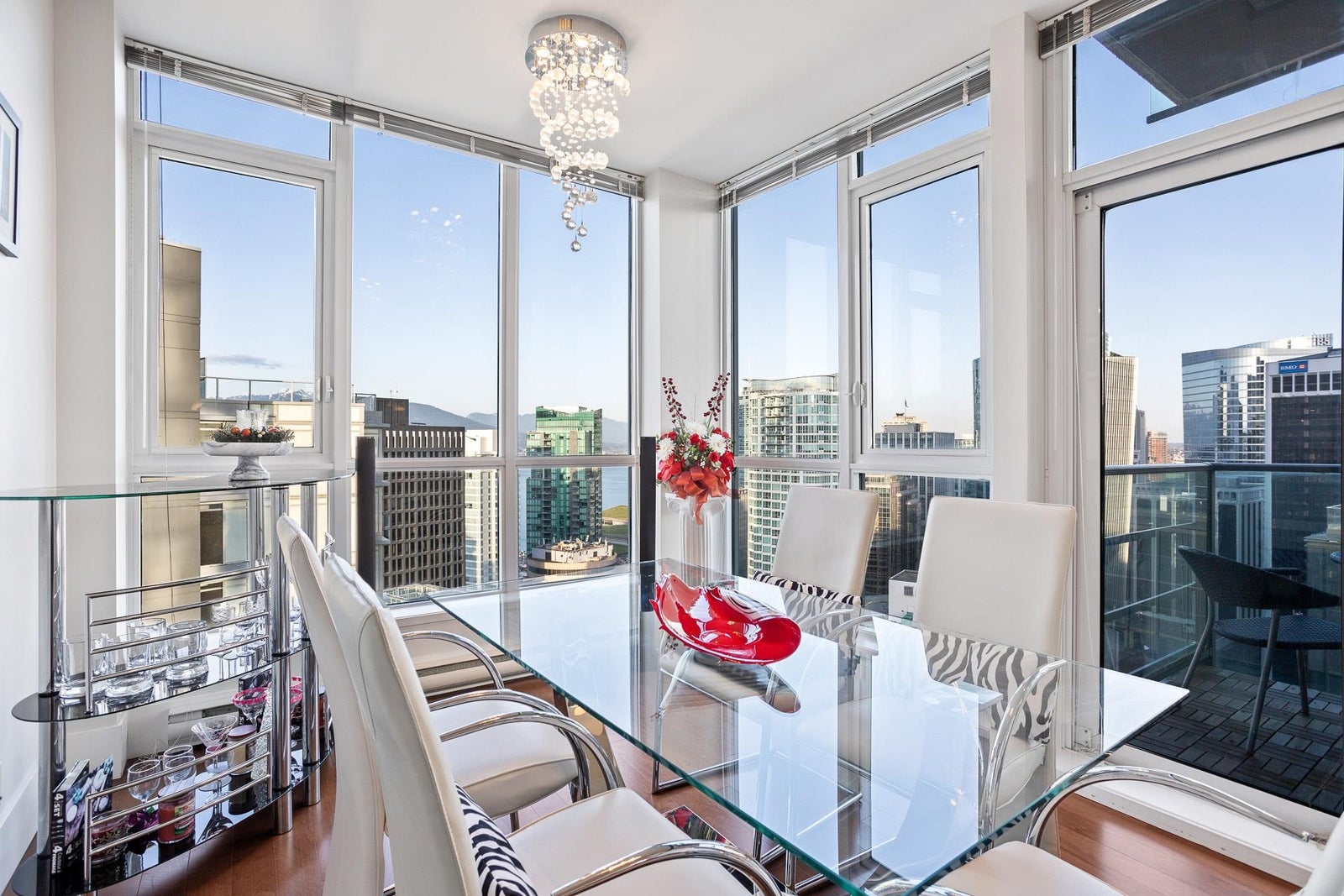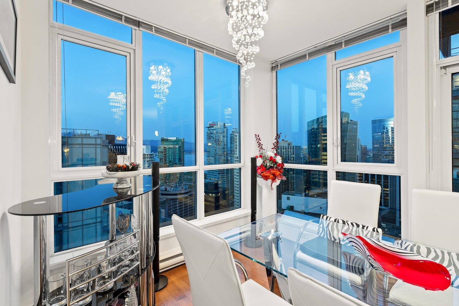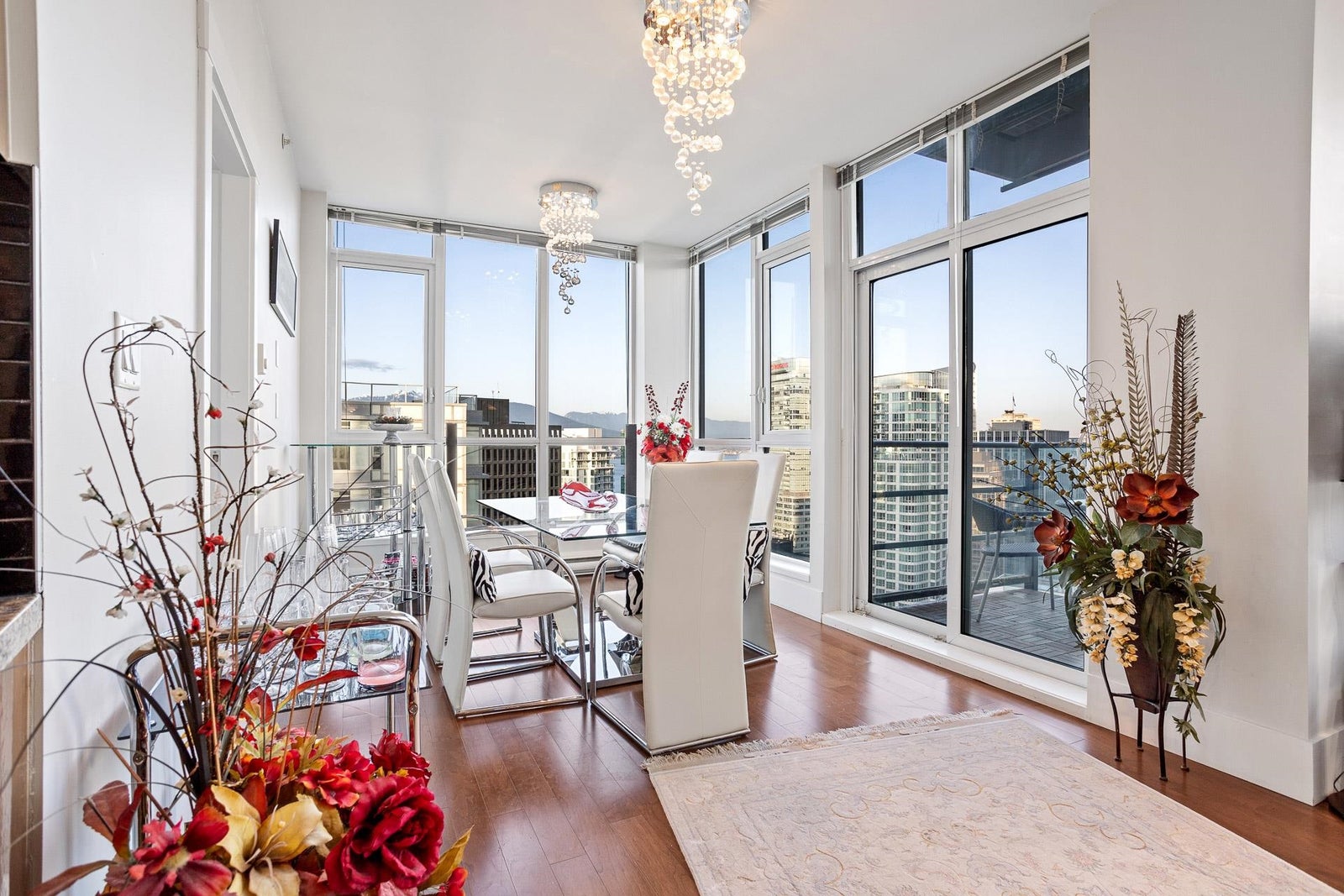 Amazing Coal Harbour living in the highly sought after building “The Melville”. This executive super well maintained 2 Bed/2 Bath upper floor corner unit offers over-height ceilings w/modern city & ocean views from the floor to ceilings windows & covered balcony. Large gourmet kitchen with tons of cabinets, stainless steel KitchenAid appliances with gas range & island with breakfast bar seating. Enjoy the convenience of an in-suite storage room & an additional underground storage. One of only a few residential towers in Vancouver with rooftop amenities, you will experience panoramic views from English Bay to Burrard Inlet, complete w/ fitness centre, sauna, outdoor swimming pool, jacuzzi, perfect for viewing the fireworks, sunsets, or observing all the activity & beauty of the city.
