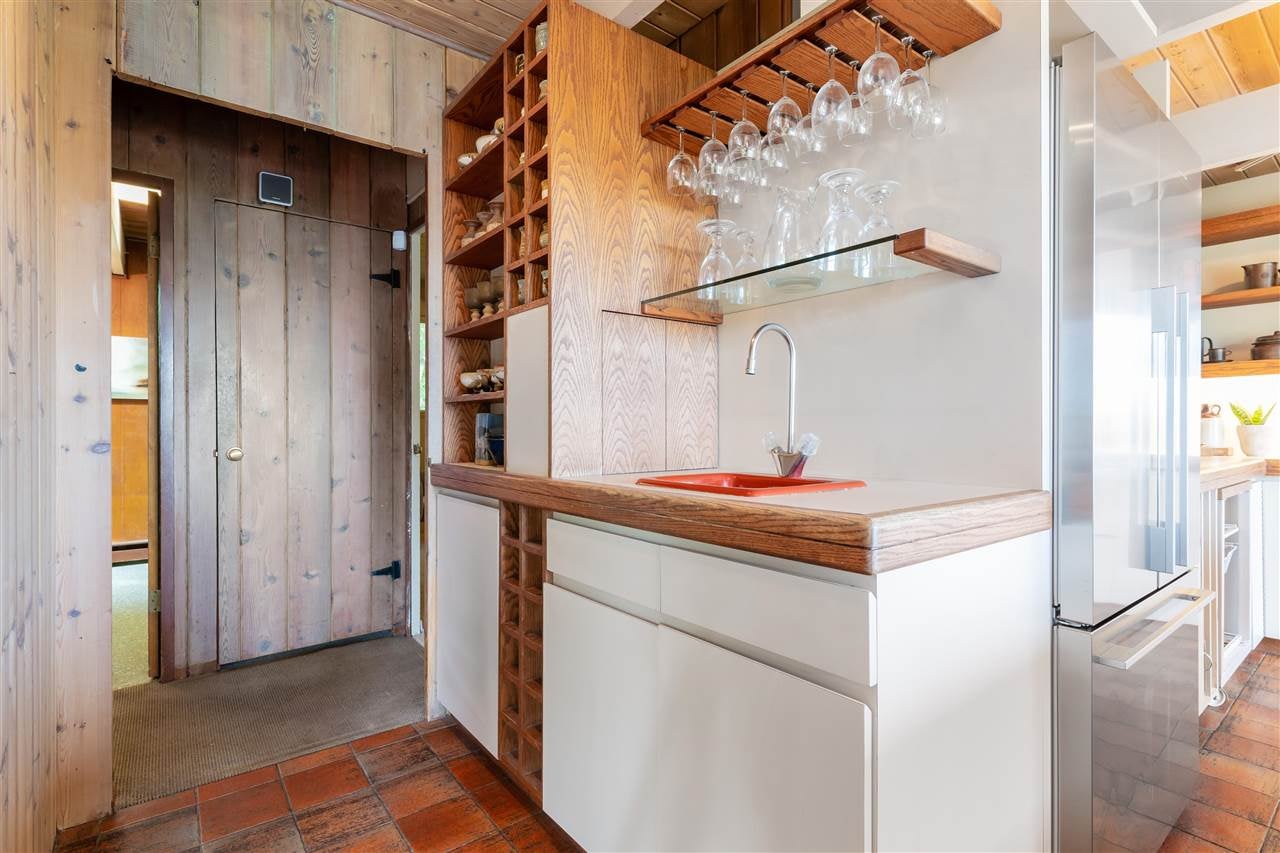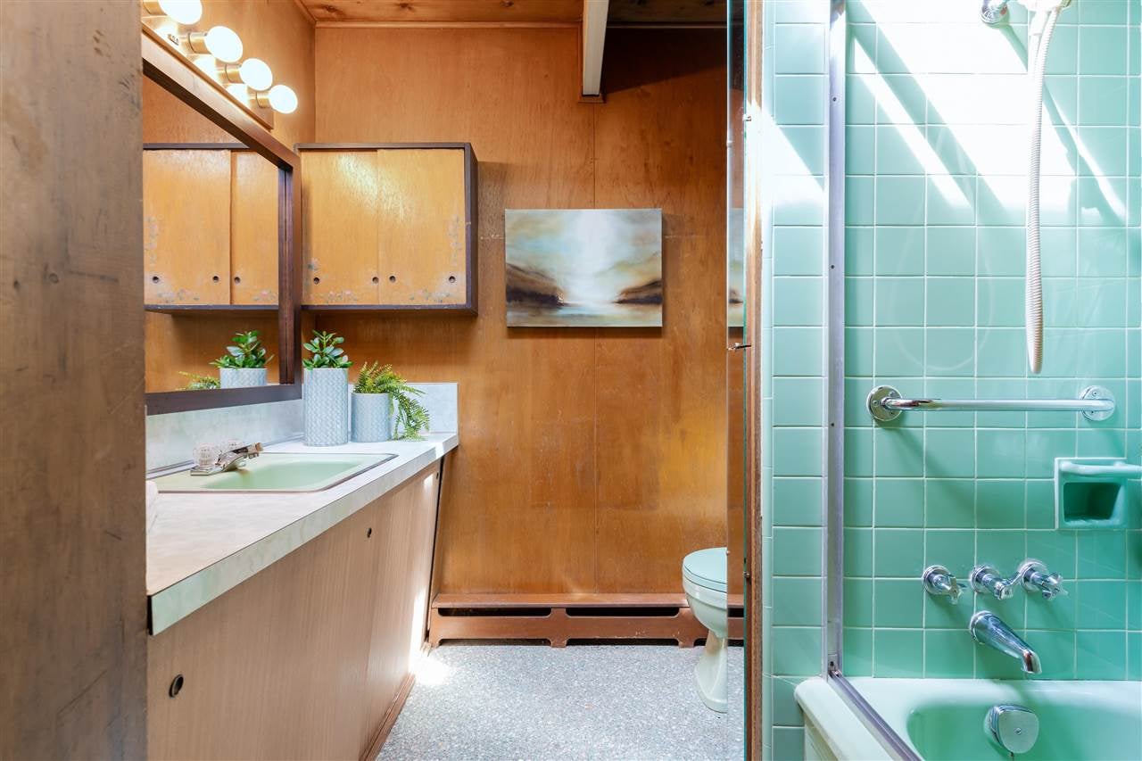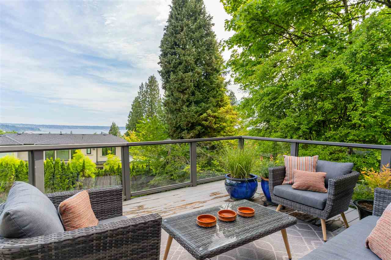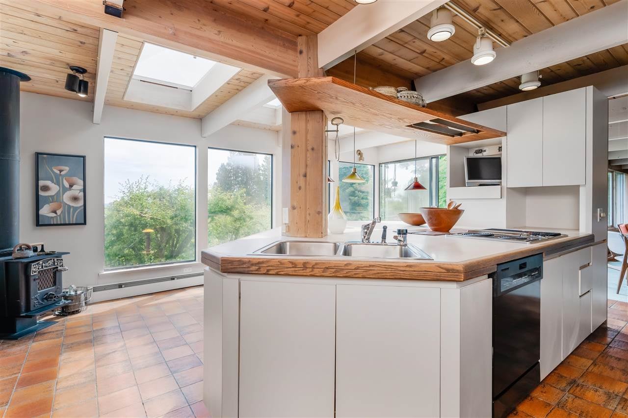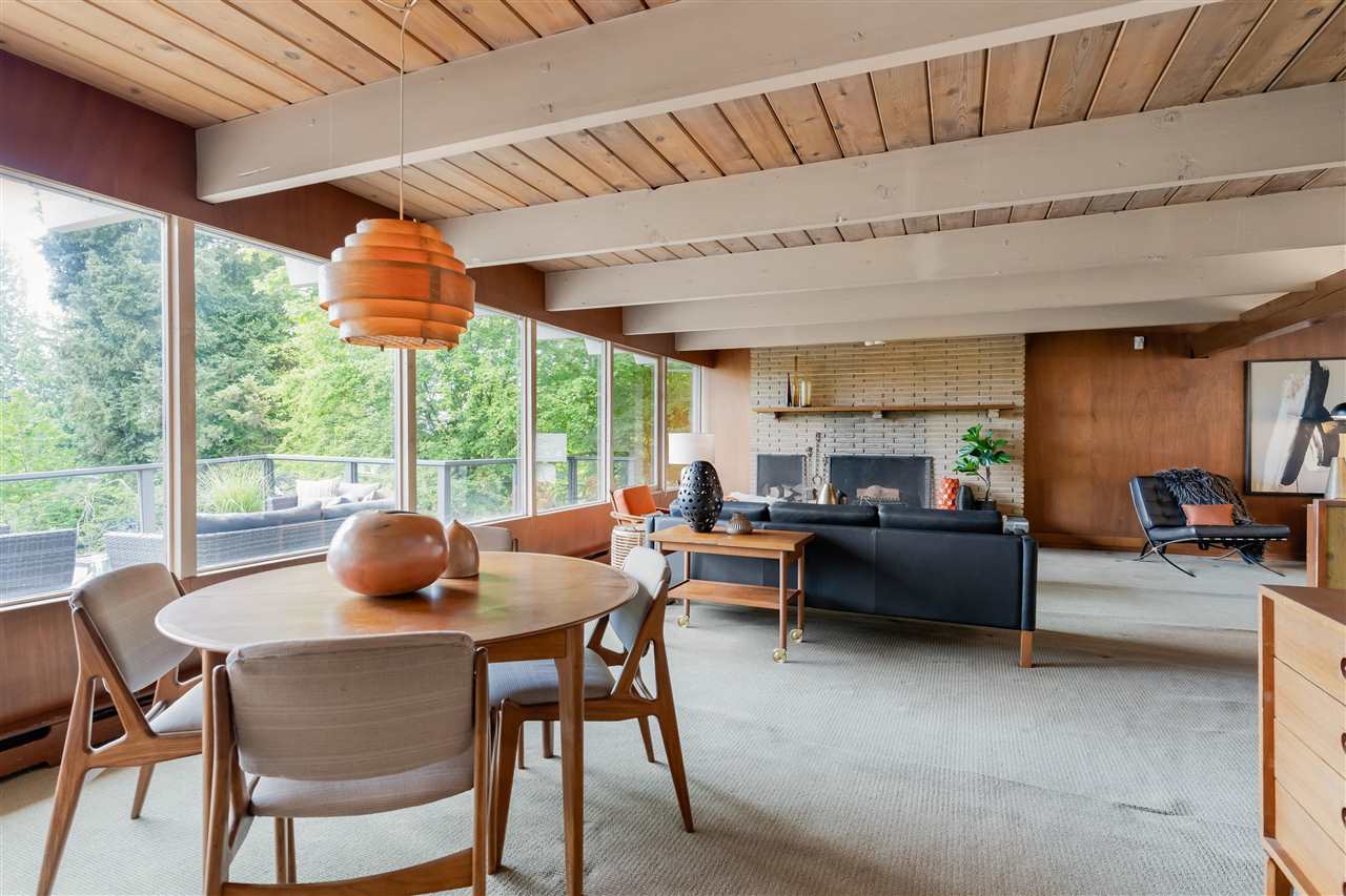 Classic Lewis post-and-beam with water views in upper Ambleside. Located on an 11,700 sq ft south facing lot, this 4 bedroom, 2 bath mid-century modern home is reminiscent of a bygone era with original cedar walls & exposed beams throughout. Step upstairs and you will be impressed by the wall of floor to ceiling windows showcasing the gorgeous water views. Open plan living/dining with wood burning fireplace, custom kitchen with circular island, skylights, stainless steel appliances and sitting area with vintage wood stove. Sliding doors open to the deck to relax with a martini & enjoy the views. Master, office & 4 pc bath complete the upper level. Family room, 3 bedrooms, laundry & storage complete the main. Backyard with laneway allows for the easy construction of a garage or coach house.